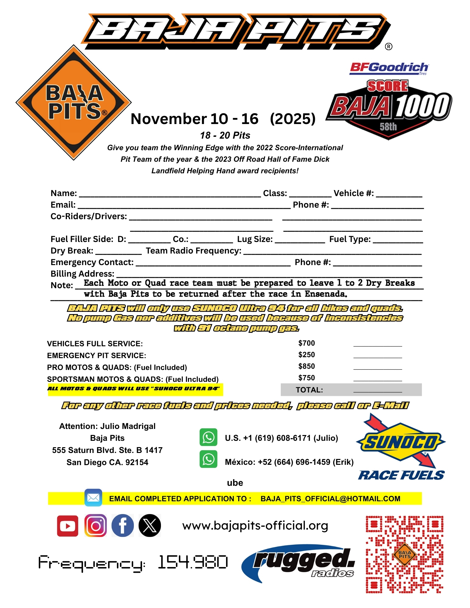 Let Baja Pits help you with your pit logistics. We set up every 50 miles along the race course.
